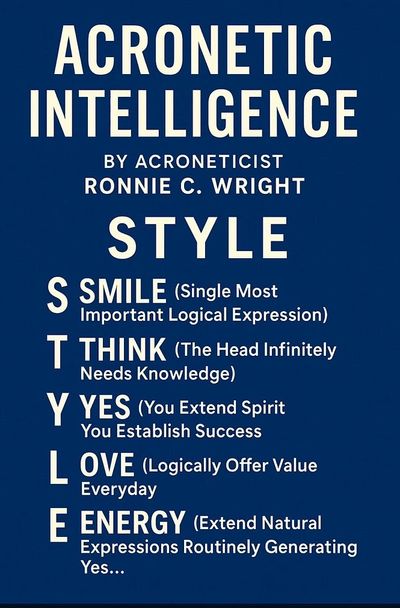 Acronetic Intelligence is a philosophical concept and self-improvement system developed by Author, Acroneticist, Artist and Designer Ronnie C. Wright. It is not a form of artificial intelligence but a framework for personal growth based on a method called "acronetics," where words and their letters are used to shape mindset, behavior, and performance.